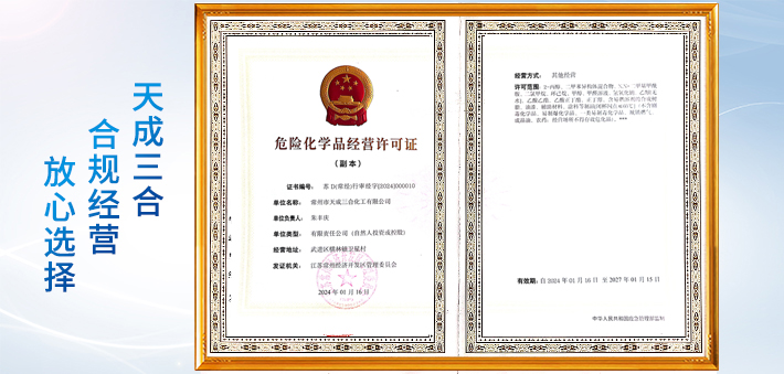 常州市天成三合化工有限公司成立于1995年,占地約8600平方米,注冊資金180萬元,固定資產約800萬元,企業類型為有限責任公司。本公司位于常州市武進區橫林鎮衛星村衛星工業園區。地處蘇南經濟開發圈中心,臨近312國道、京滬高鐵、京杭大運河、滬寧(G42)高速、沿江高速、常州機場、無錫機場,交通極為便利。我公司專業生產異丙醇(2-丙醇)、回收異丙醇、次異丙醇、廢異丙醇、醇酸清漆、醇酸烘漆、醇溶凹印油墨、粘合劑、乳化油。主推產品:工業級異丙醇-98%、工業級異丙醇-...更多